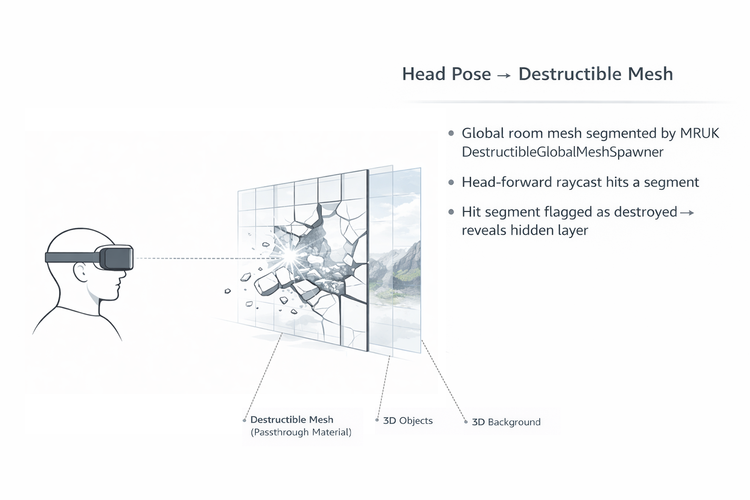 - Breaking walls functionality - The MR experience was developed in Unity using the Meta XR SDK. Leveraging the destructible mesh system allowed the environment to fracture organically, reinforcing the theme of breaking the current reality. Visitor's head movement dynamically triggers shifts in the space, revealing fragments of an emerging world behind the walls and eventually as part of the physical space.